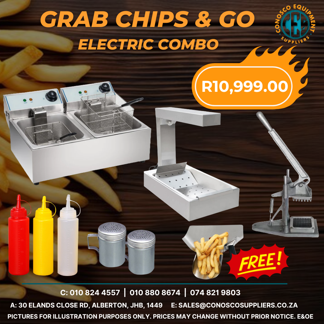 This combo is a small business start up. However you can do so much with this combo, you're not limited to selling chips only! You can sell fish, russians, fat cakes, samoosas and even make kotas.
