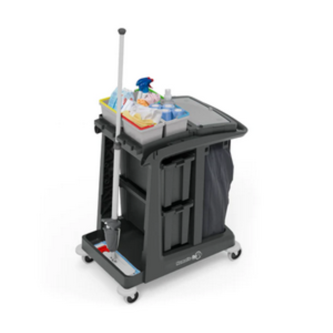 Providing the benefit of enclosed storage trolley in a small, compact design, the ECO-Matic EM2 Cleaning Trolley offers a generous 120L waste bin facility, 2 deep lockable storage drawers and top storage tray for all your cleaning equipment and supplies.